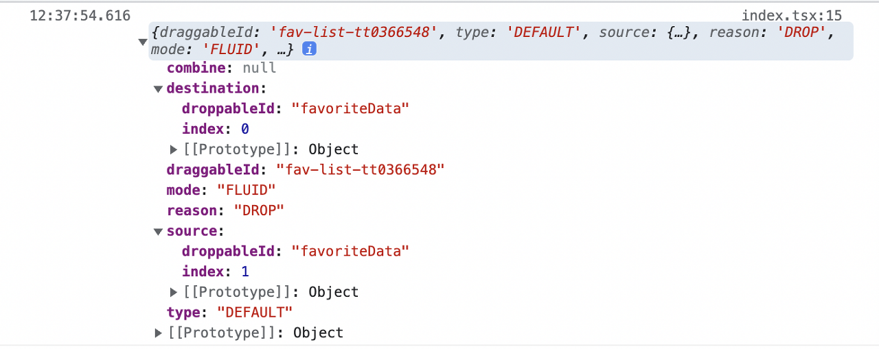 destination은 드래그한 요소가 드롭되었을 때 도착지점의 정보를 담고 있으며, 예시에서는 fav-list-tt0366548이라는 ID의 요소가 0번 인덱스로 드롭되었음을 알 수 있다