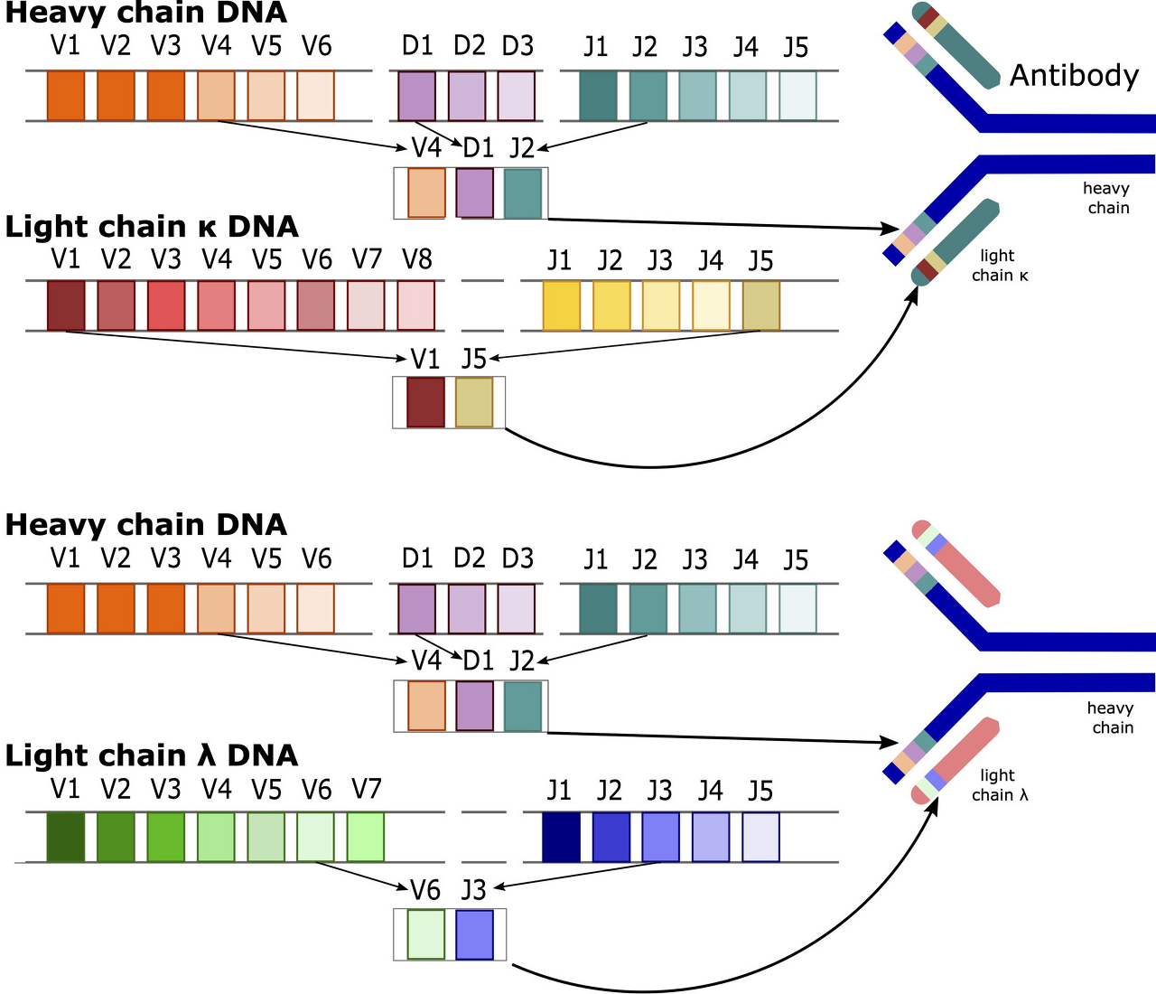 Immunoglobulin molecule consists of two identical heavy chains and two identical light chains. There are two types of light chains with similar structure --- κ and λ. Both of two light chain types have two variable regions --- V and J. To form a variable region one gene fragment is selected from multiple variants: Vκ and Jκ variants for V and J regions respectively in κ-light chain, or Vλ and Jλ variants for V and J regions respectively in λ-light chain.