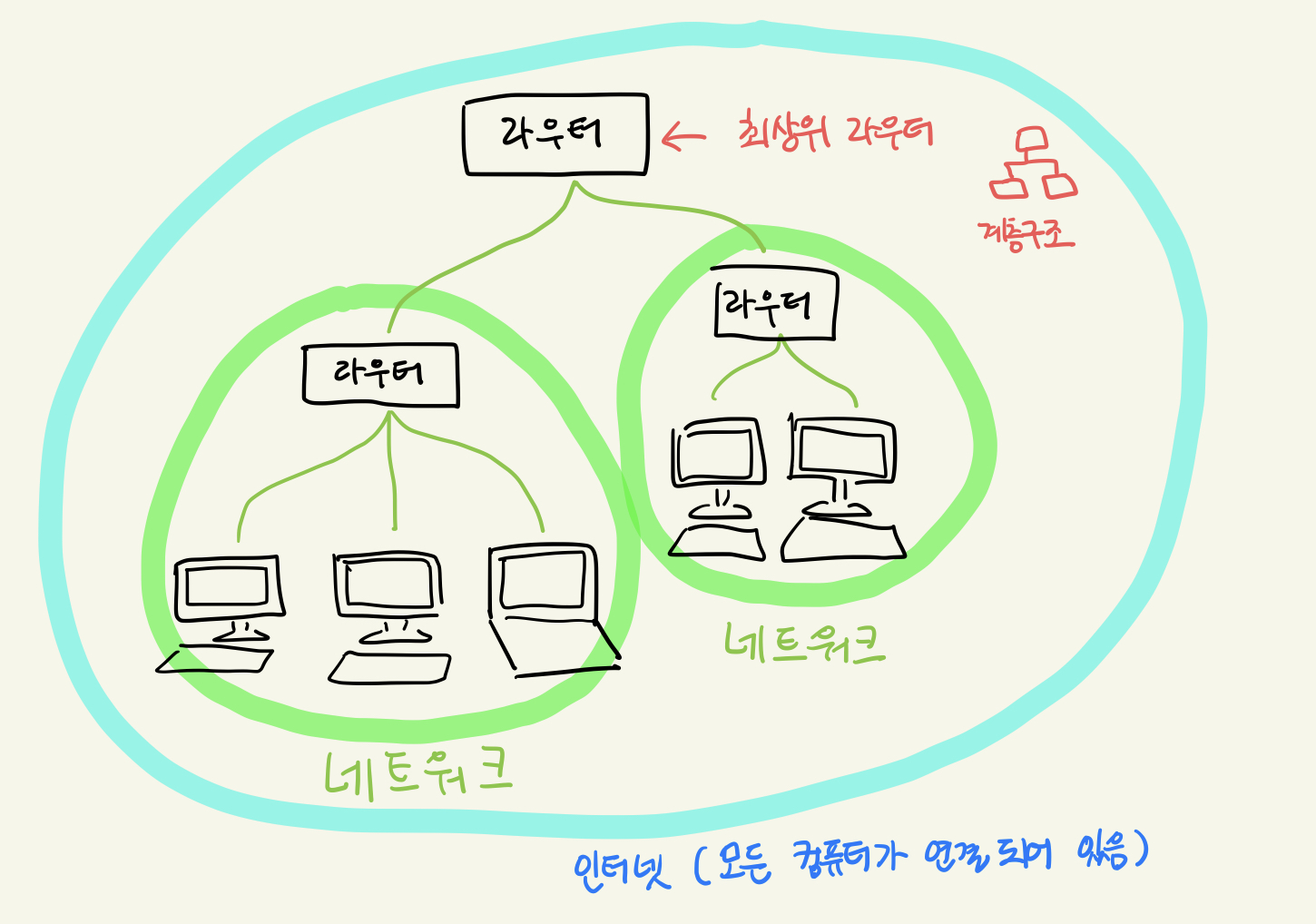 같은 라우터에 연결된 컴퓨터들끼리 같은 네트워크에 속해 있고, 라우터와 라우터가 계층 구조로 연결되어 결과적으로는 모든 라우터가 서로서로 연결되는 형태를 띈다