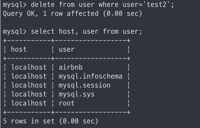 mysql> use mysql; select host, user from user; // 유저 목록 확인