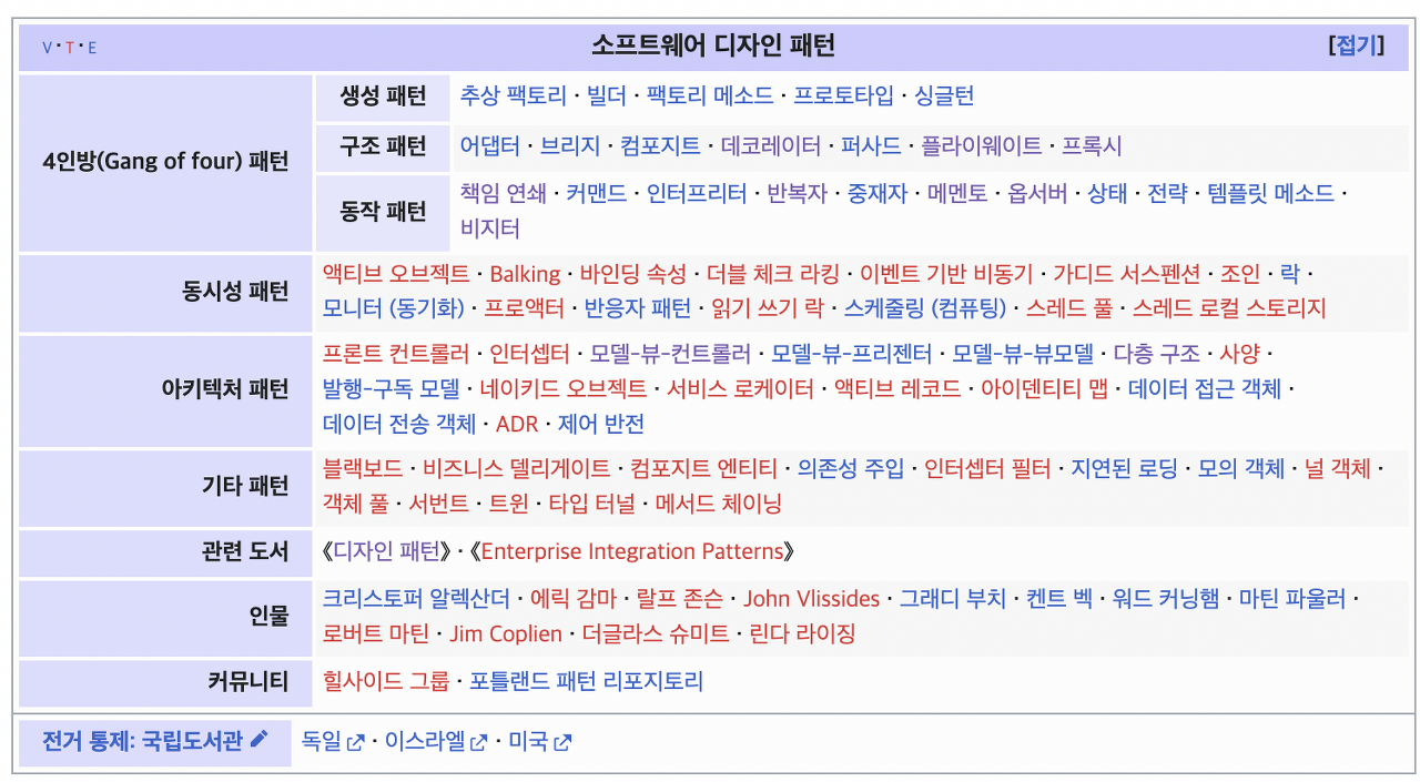 위키피디아에서는 GoF와 아키텍쳐 패턴을 뭉뚱그려 ‘소프트웨어 디자인 패턴' 이라고 이야기하고 있다… 만 검색해보면 대부분의 자료에서 사실상 ‘디자인 패턴' 이 GoF 패턴을 가리키는 말로 사용되고 있는 것 같다