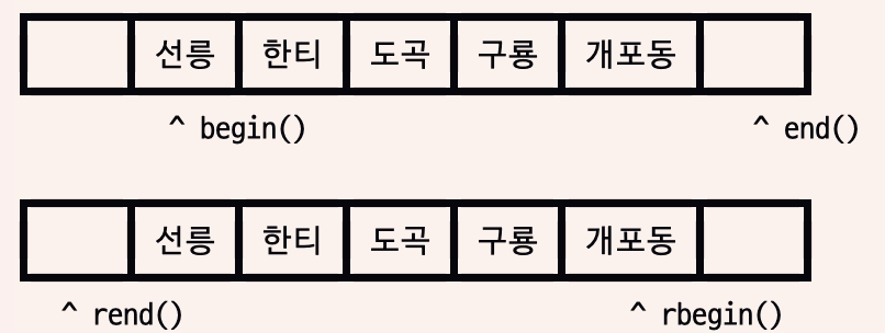 - 역방향 반복자는 정방향 반복자와 반대 방향으로 동작한다