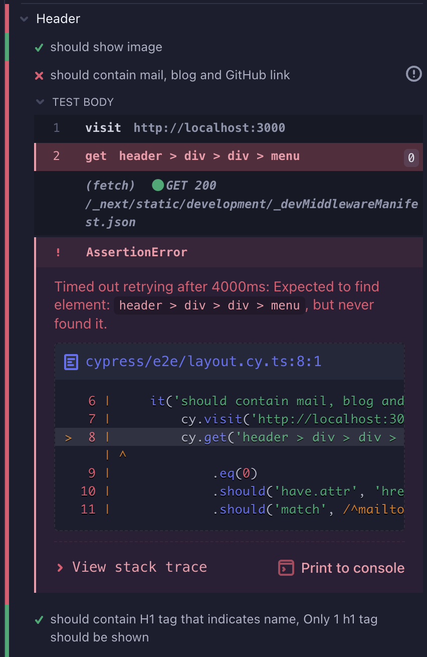 : Cypress에서 가장 많이 쓰이는 구문으로, 말 그대로 “~ 해야 한다” 를 의미한다- 어서션 (가정) 을 생성하며, 실제로 어떤 것을 테스팅할 지가 결정되는 중요한 메서드이다