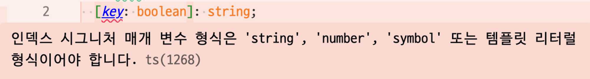 [key: boolean]: string; // 인덱스 시그니쳐 형식 오류