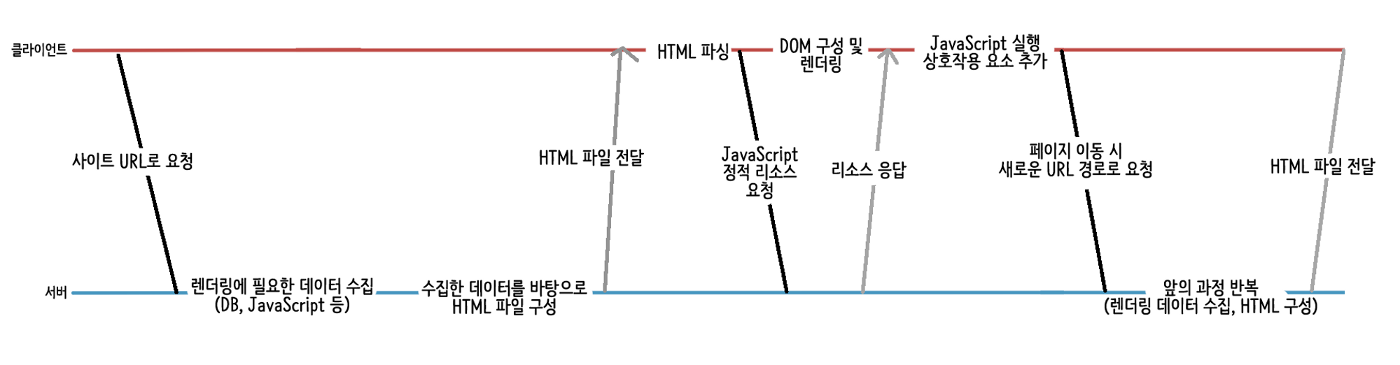 - 페이지를 이동할 경우, 이미 이전에 받아둔 자바스크립트를 통해 렌더링하며, 추가적인 데이터가 필요할 때만 서버에 요청을 보낸다