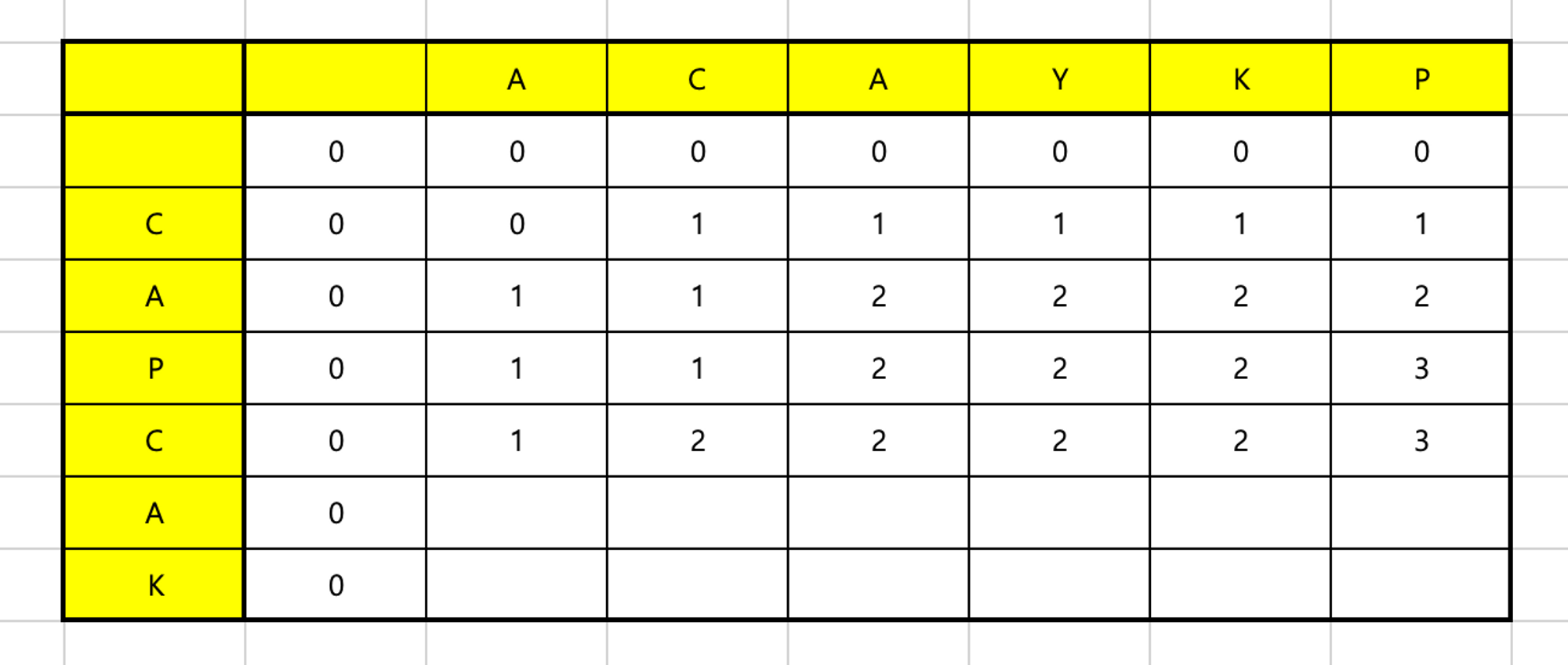 A와P가 만나는 부분 →A와CAP의 비교 → LCS:AC와P가 만나는 부분 →AC와CAP의 비교 → LCS:C또는AA와P가 만나는 부분 →ACA와CAP의 비교 → LCS:CAY와P가 만나는 부분 →ACAY와CAP의 비교 → LCS:CAK와P가 만나는 부분 →ACAYK와CAP의 비교 → LCS:CAP와P가 만나는 부분 →ACAYKP와CAP의 비교 → LCS:CAP- 이때 길이는 각각의 이전 문자열이었던