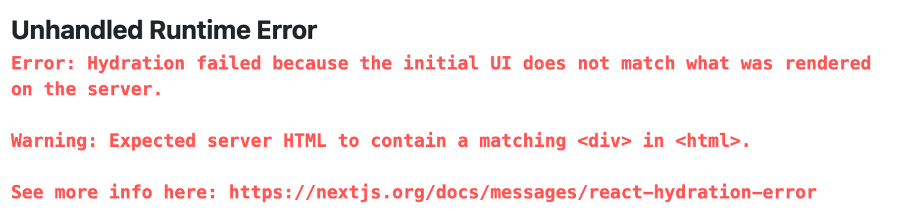 여기서 서버사이드와 클라이언트사이드의 렌더 트리의 차이가 발생하기 때문에 Hydration을 수행하는 데에 문제가 생긴다