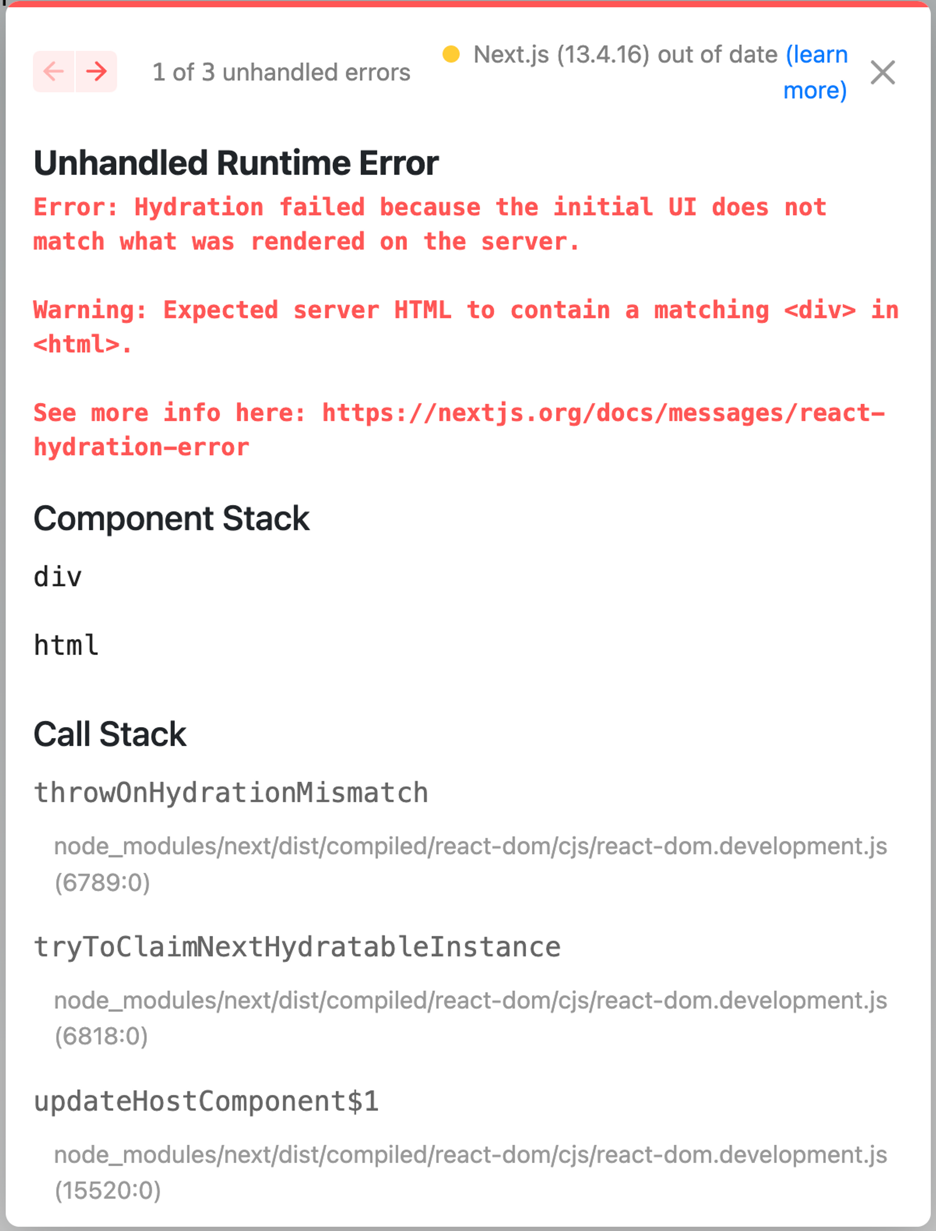 서버에서 렌더링한 UI와 초기 UI가 달라서 Hydration을 실패했다는 오류이다