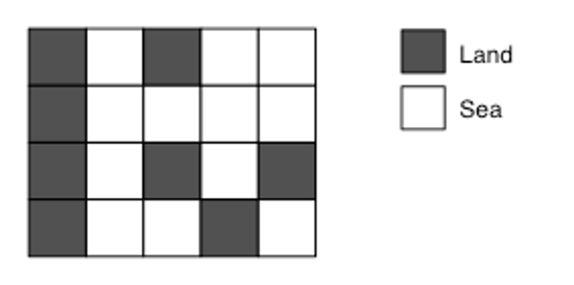 두 정사각형이 같은 섬에 있으려면, 한 정사각형에서 다른 정사각형으로 걸어서 갈 수 있는 경로가 있어야 한다. 지도는 바다로 둘러싸여 있으며, 지도 밖으로 나갈 수 없다.