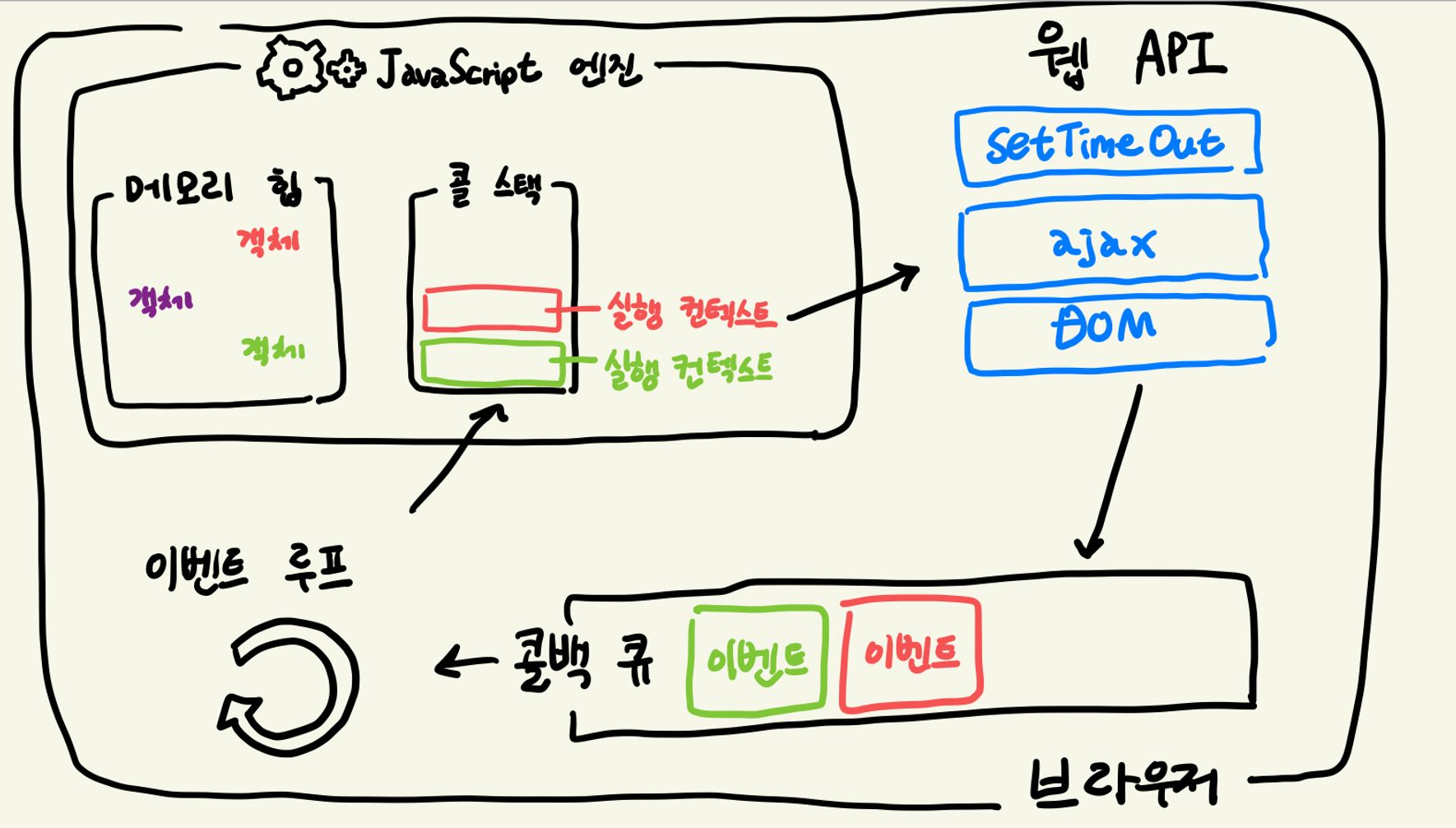 - 모든 함수가 웹 API에 의해 처리되는 것이 아니고, 몇몇 함수들만 실행 환경 (브라우저, node.js) 의 도움을 받아 비동기식으로 동작한다